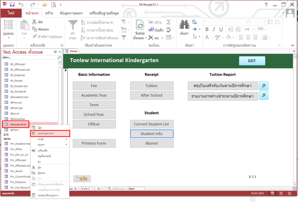1.คลิกขวาที่ตาราง tblStudentInfo แล้วคลิกมุมมองออกแบบ